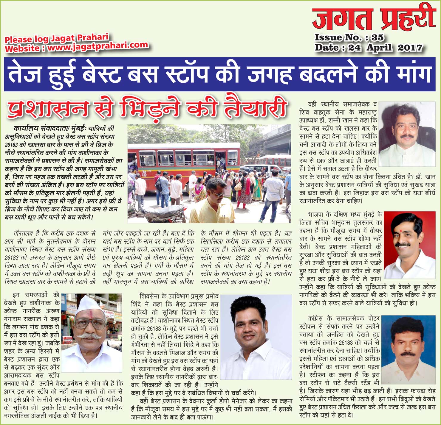 कार्यालय संवाददाता/ मुंबई। यात्रियों की असुविधाओं को देखते हुए बेस्ट बस स्टॉप संख्या 26183 को खालसा बार के पास से फ्री- वे ब्रिज के नीचे स्थानांतरित करने की मांग वाशीनाका के समाजसेवकों ने प्रशासन से की है। समाजसेवकों का कहना है कि इस बस स्टॉप की जगह मामूली खंभा है, जिस पर महज एक तखती लटकी है और उस पर बसों की संख्या अंकित है। इस बस स्टॉप पर यात्रियों को मौसम के प्रतिकूल मार झेलनी पड़ती है, यहां सुविधा के नाम पर कुछ भी नहीं है। अगर इसे फ्री- वे ब्रिज के नीचे शिफ्ट कर दिया जाए तो कम से कम बस यात्री धूप और पानी से बच सकेंगे।