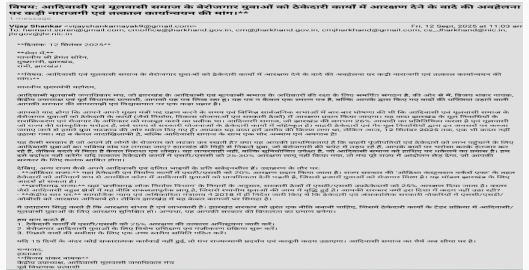एस. पी. सक्सेना/रांची (झारखंड)। झारखंड के आदिवासी एवं मूलवासी समाज के बेरोजगार युवाओं को ठेकेदारी कार्यों में आरक्षण देने के…