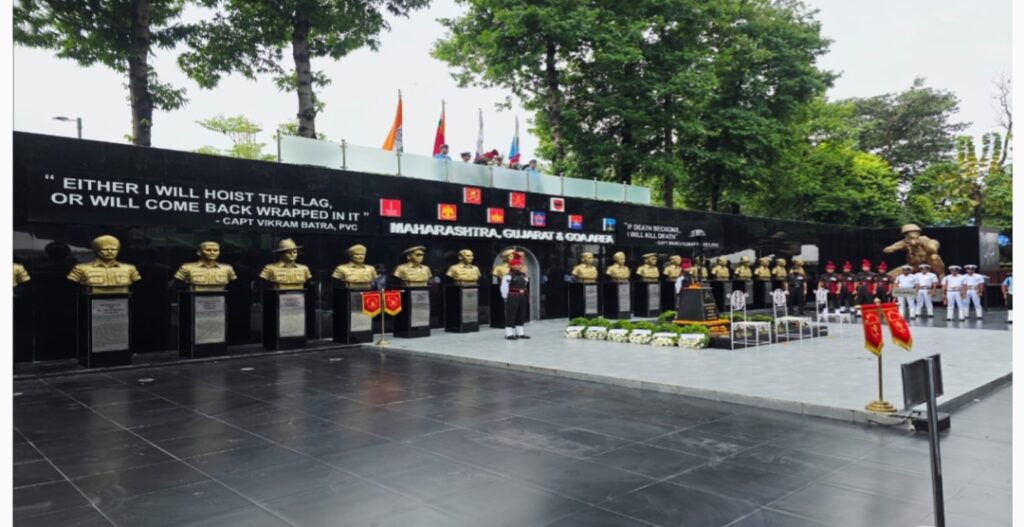 गौरतलब है कि 26 जुलाई 2025 को, 26वें कारगिल विजय दिवस के अवसर पर, मुंबई के कोलाबा स्थित त्रि-सेवा युद्ध स्मारक पर एक भव्य पुष्पांजलि समारोह का आयोजन किया गया। इस समारोह में भारतीय सशस्त्र बलों की विजय का स्मरण किया गया और हमारे शहीदों द्वारा दिए गए सर्वोच्च बलिदानों को श्रद्धांजलि दी गई। इस मौके पर लेफ्टिनेंट जनरल पवन चड्ढा, वीएसएम, एसएम, जनरल ऑफिसर कमांडिंग, महाराष्ट्र, गुजरात और गोवा क्षेत्र, वाइस एडमिरल अजय कोचर, एवीएसएम, एनएम, चीफ ऑफ स्टाफ, पश्चिमी नौसेना कमान और ग्रुप कैप्टन एसएल महाजन, कार्यवाहक एयर ऑफिसर कमांडिंग (समुद्री वायु संचालन), तीनों सेनाओं के पूर्व सैनिकों और अन्य वरिष्ठ अधिकारियों द्वारा पुष्पांजलि अर्पित की गई।
