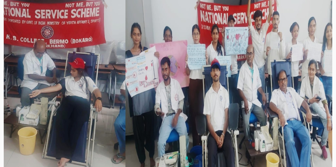 जानकारी के अनुसार राष्ट्रीय सेवा योजना (एनएसएस) इकाई ने रेड क्रॉस बोकारो की सहायता से के. बी. कॉलेज बेरमो के प्राचार्य लक्ष्मी नारायण की अध्यक्षता में कार्यक्रम पदाधिकारी डॉ प्रभाकर कुमार के नेतृत्व में मेगा रक्तदान शिविर का आयोजन विधिवत् दीप प्रज्ज्वलित कर किया गया। दीप प्रज्ज्वलित प्राचार्य लक्ष्मी नारायण, प्रो. इंचार्ज गोपाल प्रजापति, ओपी प्रभारी, डॉ अरुण कुमार रॉय महतो, रविंद्र कुमार दास, रेड क्रॉस बोकारो के प्रतिनिधि द्वारा किया गया।