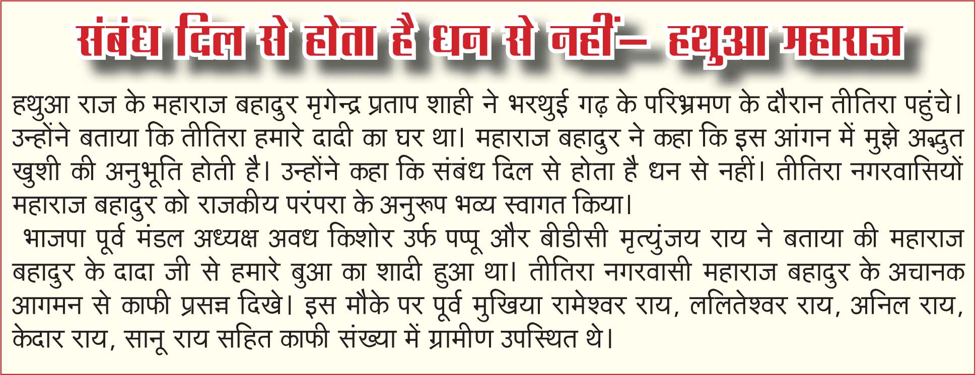 महाराज बहादुर ने बताया कि देशरत्न डॉ. राजेन्द्र प्रसाद से तथा उनके पूर्वज से पारिवारिक लगाव था। उन्होंने बताया कि देशरत्न के पूर्वज चौधुर लाल हमारे राज के पटवारी थे। राजेन्द्र बाबू छात्र जीवन से लेकर राष्ट्रपति तक हमारे परिवार से जुड़े रहे। उन्होंने कहा तीतिरा का संबंध भगवान बुद्ध के जीवन काल से है तथा यहां प्राचीन नदी हिरण्यवती के जिसका उल्लेख बौद्ध साहित्य में है।