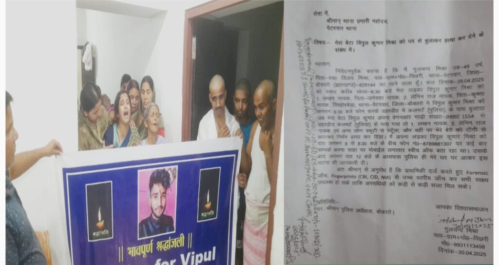 एस. पी. सक्सेना/बोकारो। बीते 29 अप्रैल की रात्रि बोकारो जिला के हद में पेटरवार प्रखंड के पिछरी रहिवासी 24 वर्षीय युवक विपुल मिश्रा की हत्या मामले में अबतक के पुलीसिया कार्रवाई से मृतक के परिजन काफी नाराज दिख रहे हैं।