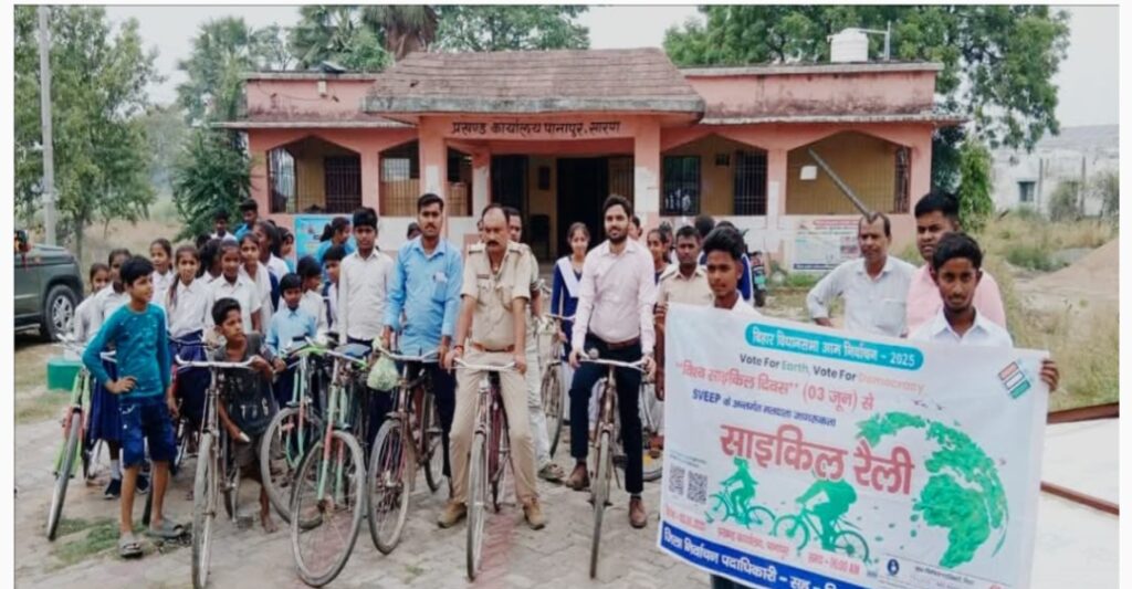 अवध किशोर शर्मा/सारण (बिहार)। सारण जिला मुख्यालय छपरा सहित जिले के सभी प्रखंडों में 3 जून को विश्व साइकिल दिवस पर वोट फ़ॉर अर्थ, वोट फ़ॉर डेमोक्रेसी थीम के साथ मतदाता जागरूकता रैली का आयोजन किया गया। आयोजित साइकिल रैली में विद्यालय के छात्र – छात्रा, भारत स्काउट एंड गाइड के कैडेट्स सहित बड़ी संख्या में युवाओं ने भाग लिया।
